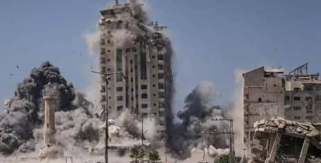 Palestinos corren a refugiarse durante un ataque aéreo israelí contra un rascacielos en la Ciudad de Gaza.